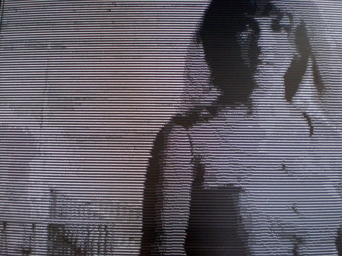 Pierre Fouché. Aime-moi moins, mais aime-moi longtemps/ Werner. 2007. Acrylic knitting yarn, perspex, 550 x 480mm. Private Collection. [Image on the right is an oblique view illustrating the optical illusion of the knit pattern]